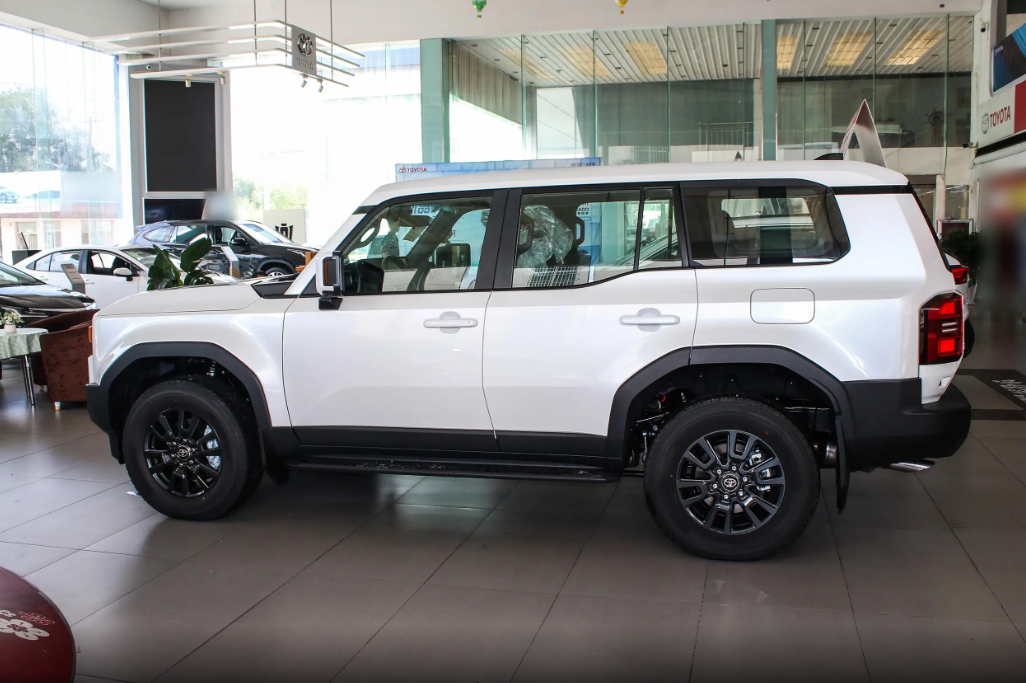 车侧的设计风格与雷克萨斯GX的车身轮廓如出一辙,平直的腰线从车头贯穿至车尾,方正宽大的轮眉凸显越野感,进一步提升了车辆的力量感。前低后高的窗线设计非常实用,方便驾驶员越野时探头观察,黑色的塑料轮眉和车身下方的防擦板让整车看起来更显野性,同时也降低了小剐蹭的维修成本。除此之外,车辆的尾部取消了经典的外挂备胎的经典设计,两侧后尾灯采用纵向布局,保留了原始越野的味道,并且尾部“Land Cruiser”以及丰田LOGO都采用黑色设计,壮硕的后保险杠也表明了丰田普拉多硬派SUV的定位。