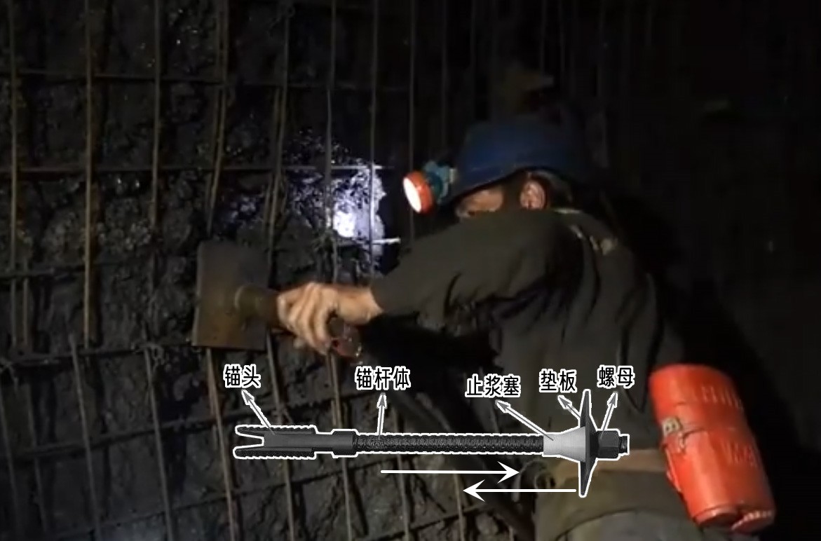 锚杆安装后,锚杆上的垫片在螺母锁紧后压于岩壁上提供了力学支撑,防止岩壁脱落甚至垮塌,垫片对岩壁的压力产生的反作用力来自于锚杆的拉力,而锚杆的拉力在水泥的固定下作用到整个岩体,使洞壁与深层岩体重新构成一个力学整体,达到支护加固的目的。
