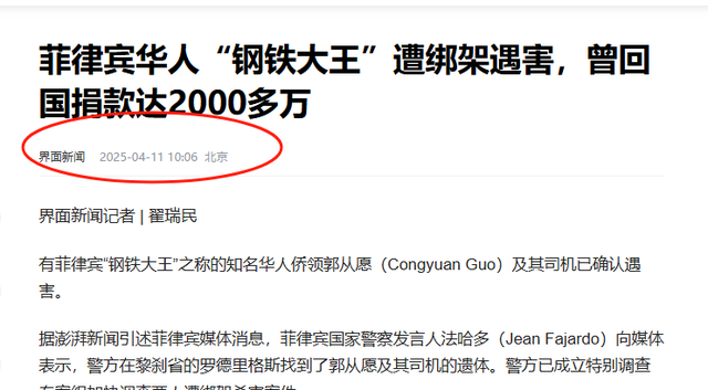 信息来源:界面新闻 2025年4月11日 《菲律宾华人“钢铁大王”遭绑架遇害,曾回国捐款达2000多万》