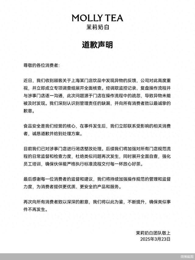 3月24日,北京商报记者了解到,茶饮品牌茉莉奶白发布道歉声明称,茉莉奶白近日收到顾客关于上海某门店饮品中发现异物的反馈,公司立即成立专项调查组展开全面核查。经调取监控记录、复盘操作流程并与涉事门店逐一沟通,此次问题源于门店在操作流程中的疏忽,导致异物未能被及时发现。