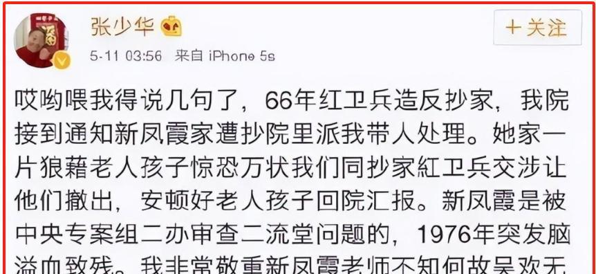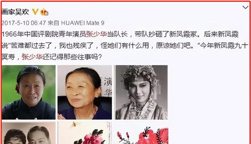 多年后,画家吴欢在社交平台上公开指控张少华带队抄家,导致母亲新凤霞终身残疾,并指控她劫掠齐白石先生的画作。