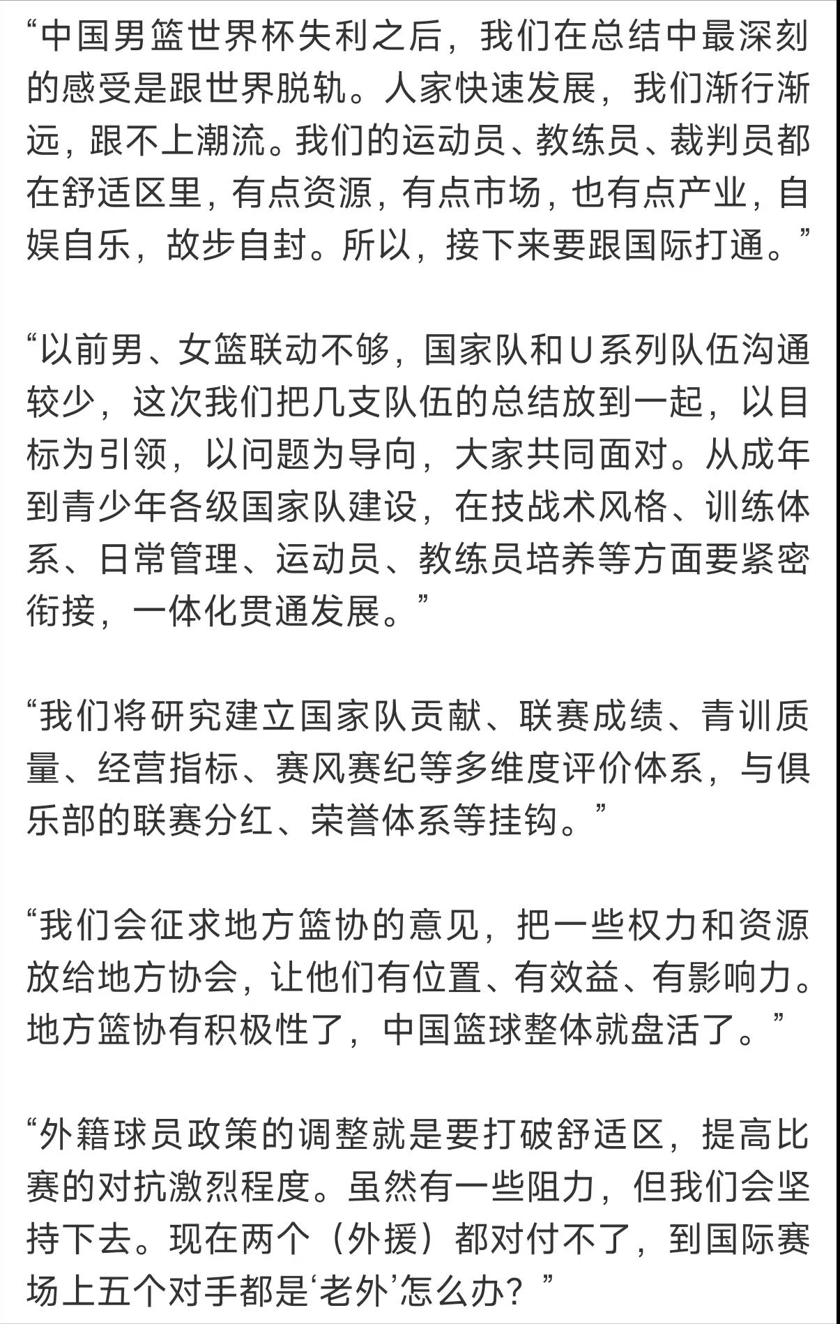 第三个消息来自中国篮协,目前中国篮协主要任务就是备战2028奥运周期,同时信任篮协主席郭振明近日访谈中表示:中国男篮严重与世界脱轨,男女篮跟U系列沟通较少,目前联赛也是故步自封,为了加强跟世界篮球联系,外援政策将进一步开放,打破国内球员的舒适区,现在每节两个外援都对付不了,到了国际赛场对方5个老外怎么打?