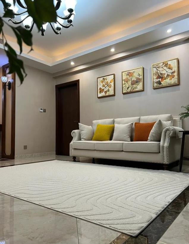地面铺的是光滑的瓷砖,颜色明亮干净,而且非常平整,光线一打上去反射出吊灯的影子,显得特别高级,完全符合现代家居的美学标准。