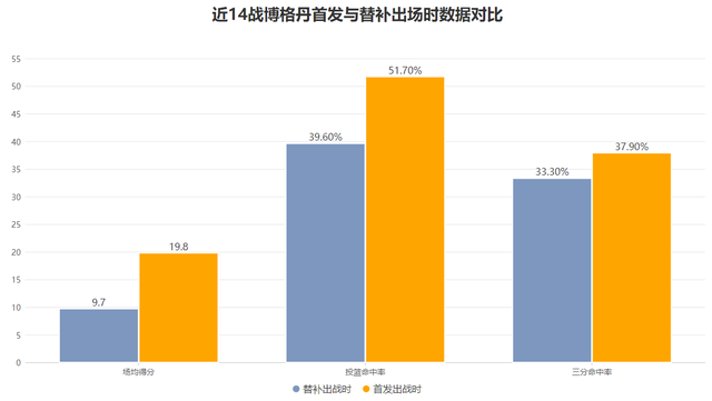 当博格丹替补出战时,他场均贡献9.7分,两项命中率分别为39.6%与33.3%,这样的表现的确是难称优秀;但当他首发出战时场均得分提升到19.8分,两项命中率升至51.7%与37.9%,无论的得分数量还是得分命中率均出现了质的飞跃。