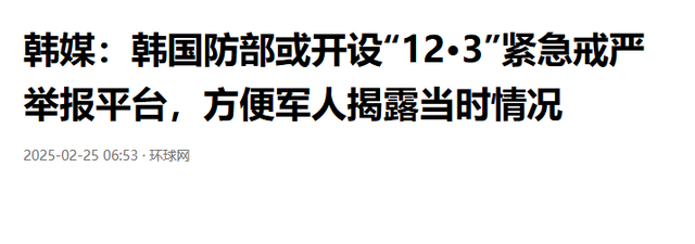 韩媒:韩国防部或开设“12·3”紧急戒严举报平台,方便军人揭露当时情况——环球网