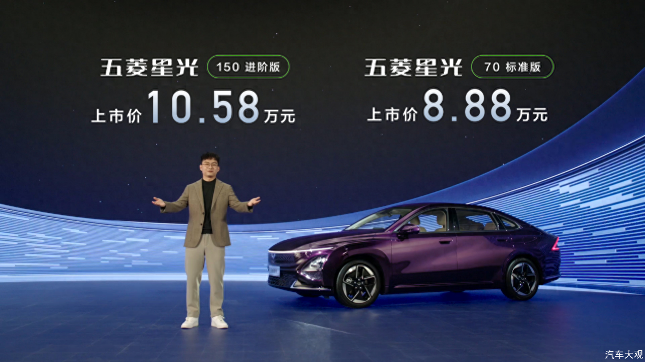 2023年12月6日,五菱官宣旗下首款超A级家轿五菱星光正式上市。新车提供70标准版和150进阶版两款配置,价格分别为8.88万元和10.58万元。