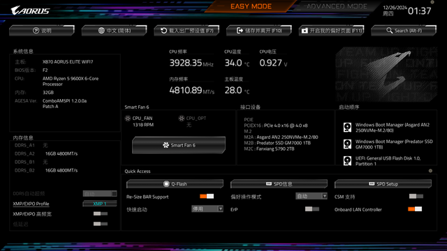 开机效果图,整机个人还是比较满意的,虽说没有用高大上的水冷,但对于R5 9600X这款处理器来说,风冷也是完全够用了。