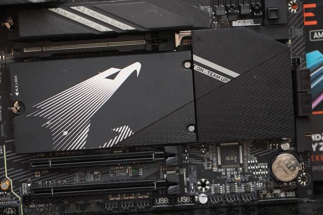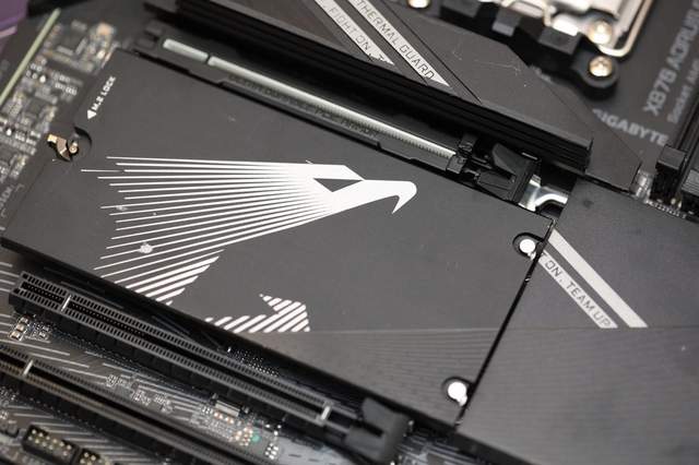 在M.2插槽方面,技嘉小雕X870 WIFI7总共配备了4个,其中最上方的有单独的散热片是CPU直连提供,是主力的接口,支持PCIe 5.0 x4的传输带宽,只有一个M.2固态就用这个就好了。