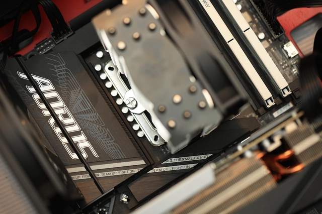 供电部分的散热装甲采用一体式设计,沟槽设计有有效增加散热表面积,提升散热效果,表面线条勾勒的LOGO也是很好的增加了颜值。