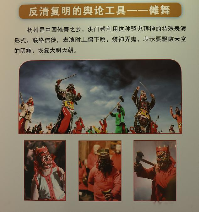 南丰是中国汉傩之乡,临县南城洪门帮利用这种驱鬼拜神的特殊表演方式,联络信众走门串户进行傩舞驱鬼表演(南丰古傩舞有驱鬼这一项的表演),以表达“驱除鞑虏,恢复大明”的愿景。洽湾古镇明清时期亦有走门串户傩舞方面的表演。