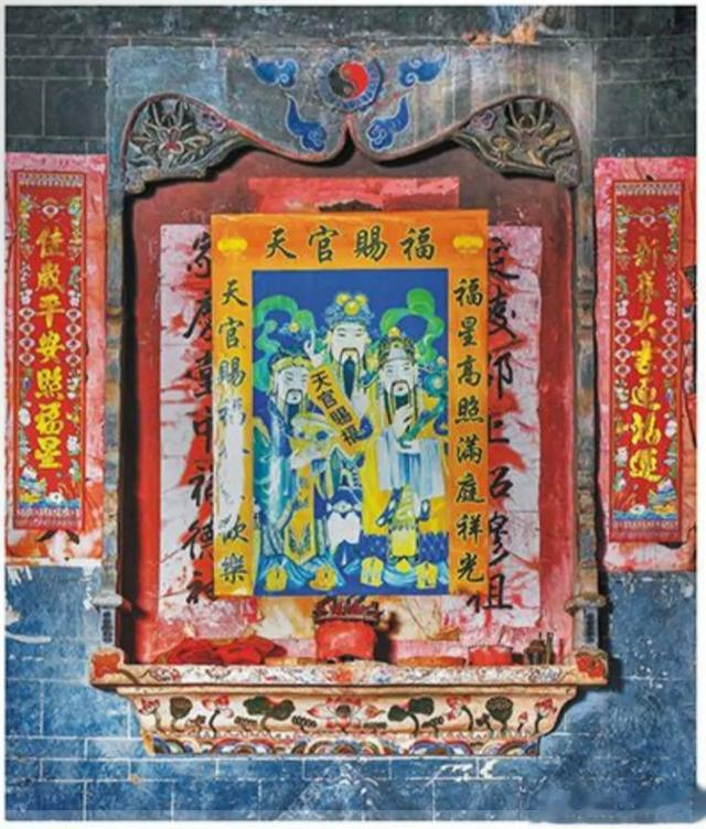 仙源公祠,始建于明末清初,相传屋主原为道门修士。该建筑大门与巷道呈斜状,据说为屋主故意为之,用“歪门邪道”的暗喻,表达对大清朝廷的不满。堂屋的神龛造型及绘画独特,为南丰仅有。悬挂在神位之上的红黑蓝三色八卦乾坤图,与周围的四朵蓝色祥云组成了神秘的图画,相传这八卦乾坤图与洪门的标志、旗帜相吻合。