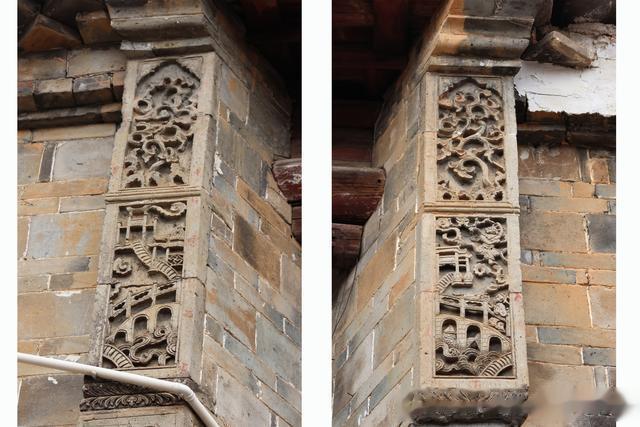大门门斗樨头石雕雕有精湛工艺的草龙、卷草、梅花、春寿合体字等浮雕图案、凤凰、以及花篮与对槔含口莲花盏圆雕。室内直棂窗木雕、高窗窗花、雀替、梁垫、石柱础等雕塑非常的精致,很值得一看。