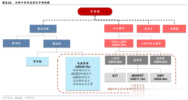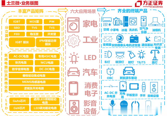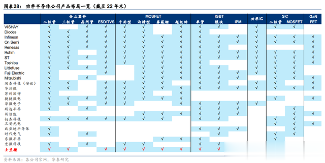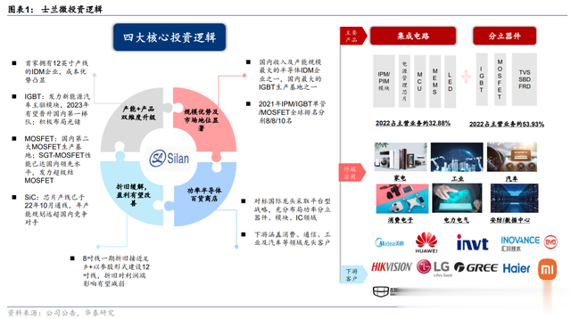 分立器件为公司核心业务:具体产品主要包括IGBT、MOSFET、TVS(瞬态抑制二极管)、SBD(肖特基二极管)、FRD(快恢复二极管)、开关管、稳压管等产品。公司的超结MOSFET、IGBT、FRD、高性能低压分离栅MOSFET等先进产品的性能已经达到国内顶尖水平,除了传统的白电和工业领域,公司已逐步切入电动汽车、新能源(光伏、风电、储能领域),预计未来仍将保持较强劲增长。