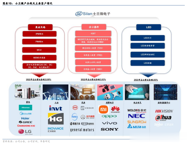 发光二极管方面,公司加快向中高端产品方面倾斜:具体产品主要包括LED芯片和LED彩屏像素管。子公司士兰明芯加快高亮度LED照明芯片开发,加快导入汽车和景观照明等中高端芯片市场,士兰明镓加快小间距显示、miniLED显示屏、红外光耦、安防监控和车用LED等中高端应用领域拓展。