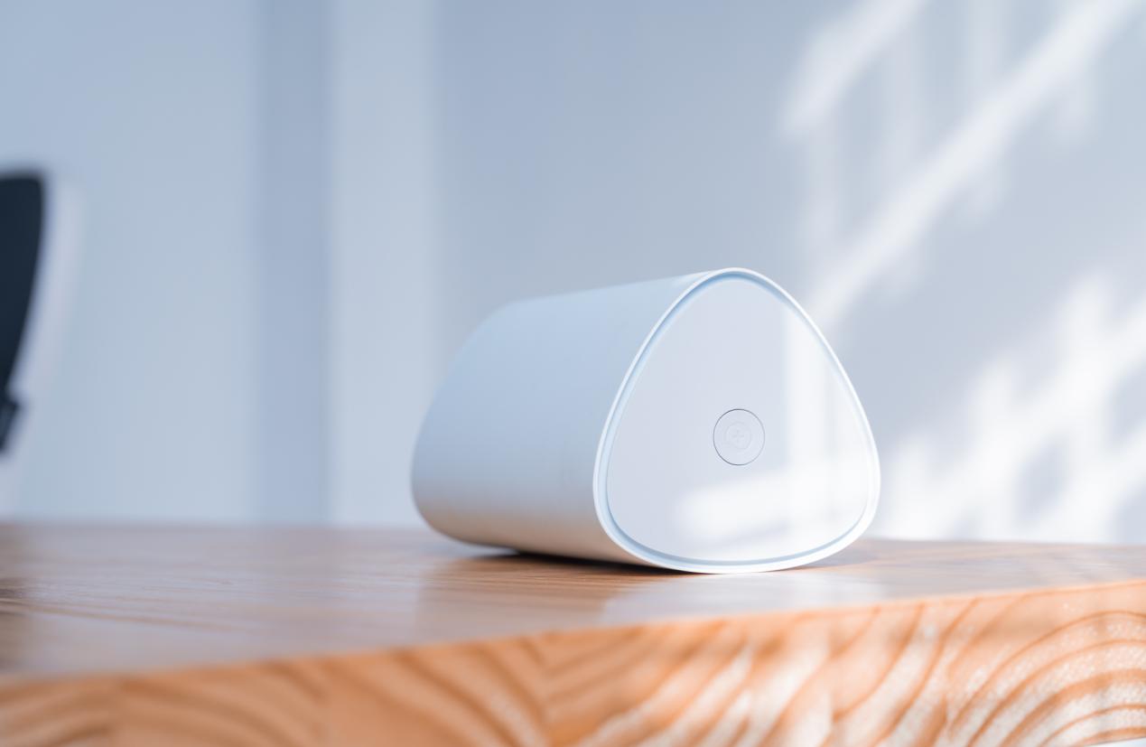 三棱柱造型,边缘是圆弧设计。正面一颗指示灯,和M5不同的地方在于京东云·360全屋路由的颜色,是淡蓝色。同时左侧边有高通的logo标识,因为它用的高通的五核芯片。