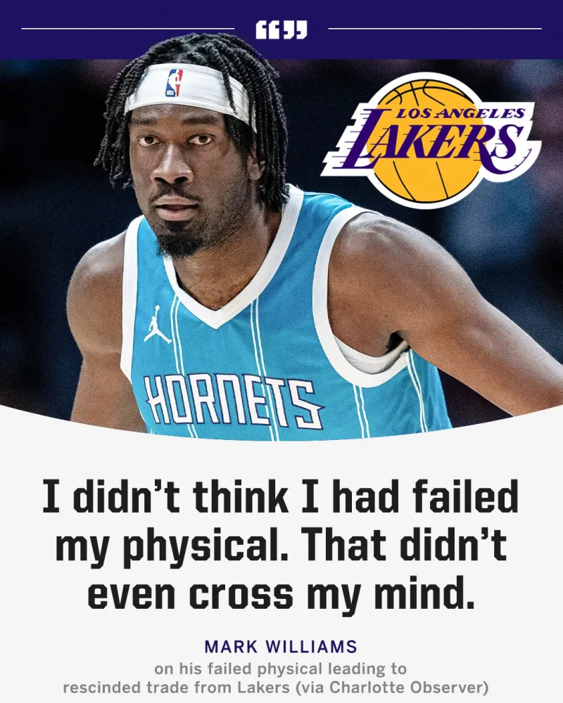 此前,湖人队用克内克特、雷迪什、1个首轮签和1个首轮签互换权从黄蜂队换来了潜力中锋马克-威廉姆斯,然而仅仅数日之后,这笔交易便因“未能满足交易条件”而被取消,具体原因是威廉姆斯未能通过湖人的体检。