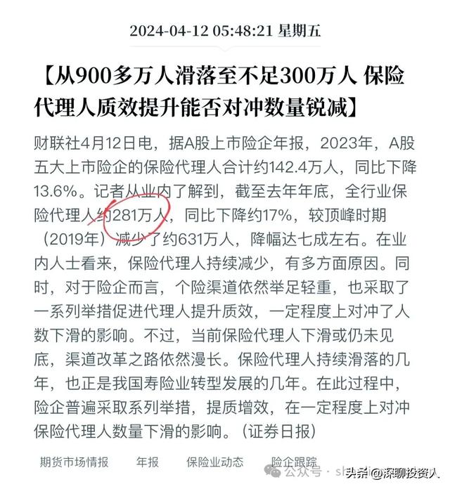 截至2023年底,国内保险代理人约281万人,较2019年巅峰时期的900万人,减少了约631万人,降幅达七成!