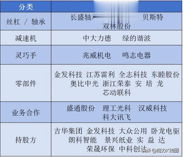 这部分主要包括丝杠、轴承、减速器、灵巧手、零部件等为宇树机器人提供零部件供应的公司。