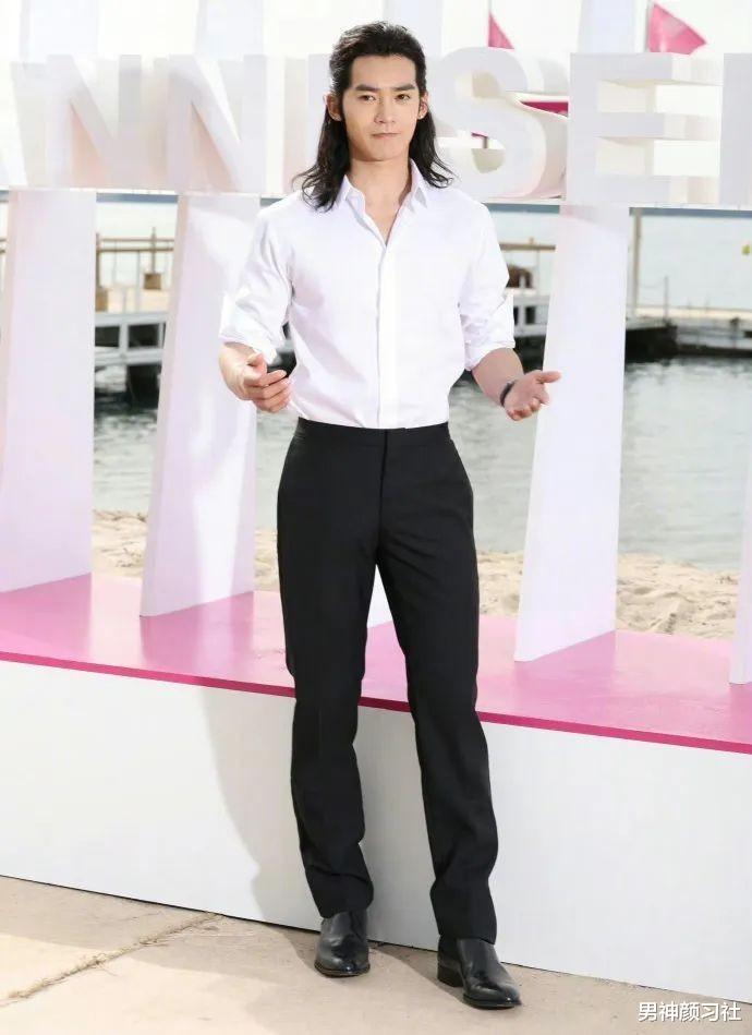 于适的这身也是蛮经典的,用了男士很爱的两个单品。不过,他的这头头发算不上很清爽,所以相对来说整身look看着有点拖沓。建议男生们在穿这套衣服的时候都选短发。