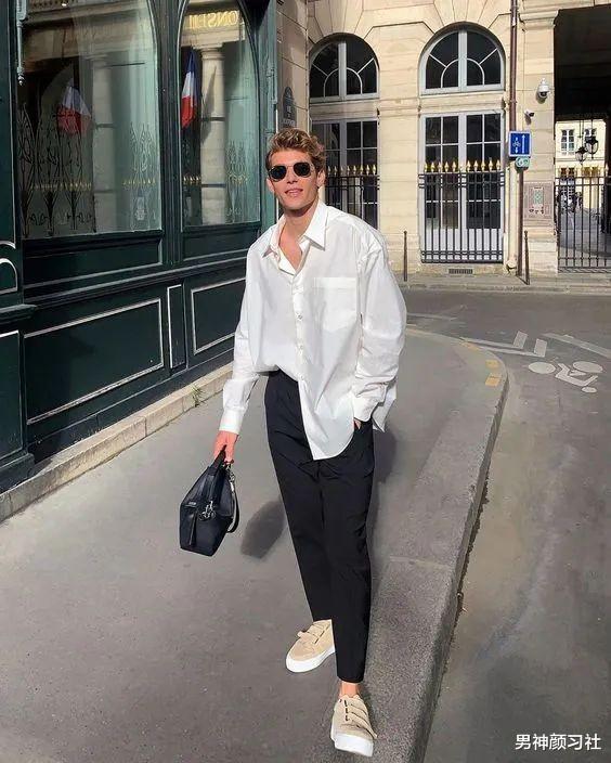 下面这身就是流传了好几年的图,无论什么时候看都非常经典。这和他的选品也分不开关系。大家在选白衬衫的时候,一定不要找太宽大的,肩线的位置要靠上方,这样你的穿搭才不会太拖沓。