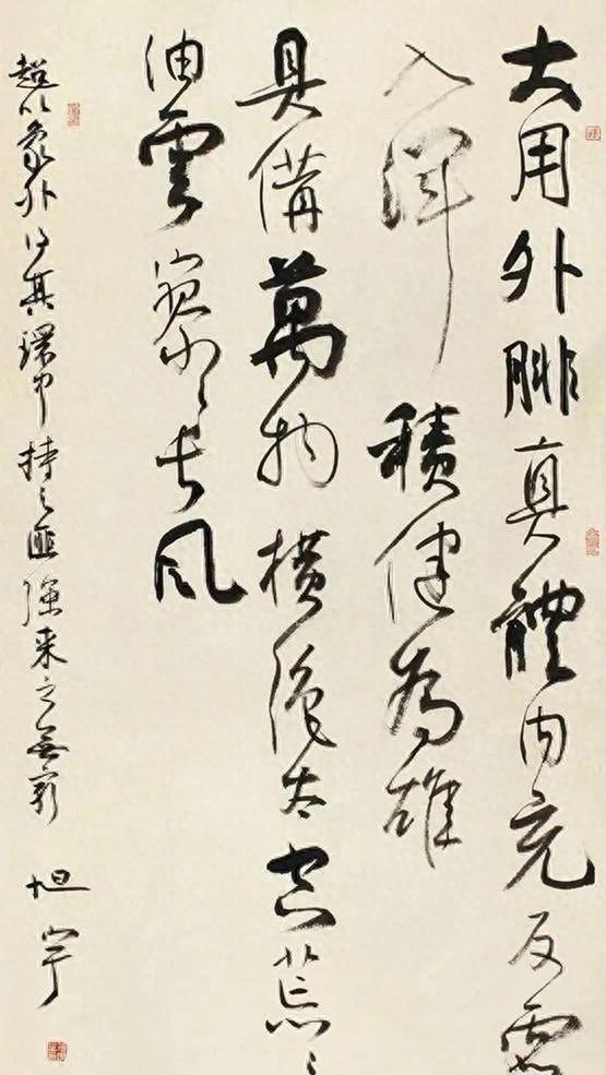 旭宇的《诗品二十四则·雄浑》,旭宇的笔下,字如其人,雄浑大气。他的用笔劲健而不失潇洒,每一笔都充满了力量与节奏,如同诗中所言“大用外腓,真体内充”,给人以强烈的视觉冲击和心灵震撼。旭宇的“大”字,起笔如泰山压顶,稳重而有力,一笔之下,仿佛蕴含着无穷的力量。“用”字则如同流水行云,笔势流畅,转折处自然而不失力度,展现出一种内在的张力。