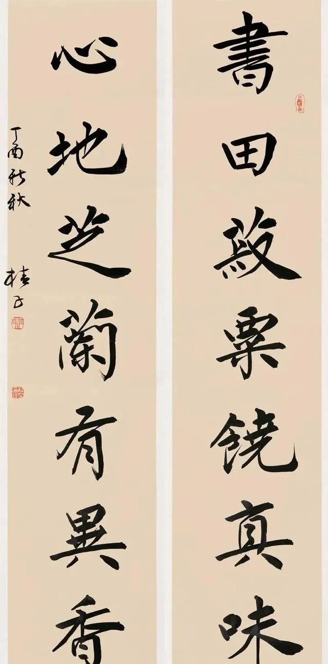 任桂子的《书田菽粟》,任桂子的书法,典雅而高古,俊秀而多姿。她的字,如同田间的菽粟,真味盎然;又如心地的芝兰,异香扑鼻。她的书法,既有晋唐的韵味,又有现代的风采。任桂子的“书”字,笔法典雅,字形端庄,每一笔都透露出一种文人的风骨。“田”字则如同田间的阡陌,笔势平直而有力,展现出一种朴实无华的美。