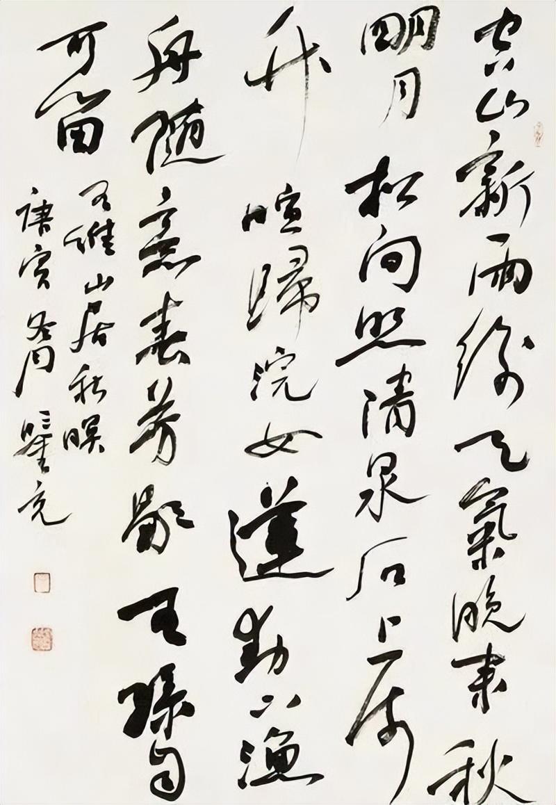 肖建科的《山居秋暝》,淡远而清新,用笔率意,飘逸而不失法度。他的字,如同诗中的意境,既有山居的宁静,又有秋暝的深远,给人以无限的遐想。肖建科的“山”字,笔法淡远,如同远山的轮廓,充满了宁静和深远。“居”字则如同山居的宁静,笔势平和,结构紧凑,给人以隐居山林的意境。