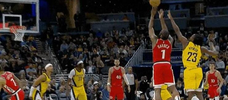 快船队这边也不甘示弱,哈登迎着防守命中了一记高难度的撤步三分球,这也是快船队本场比赛的第一个运动战进球。
