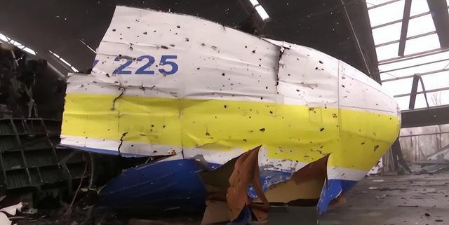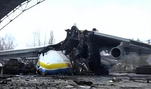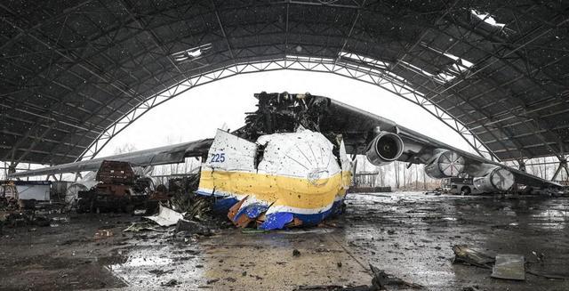 它被停放在乌克兰的安东诺夫机场中,坍塌的机库之下,运输机前半部分完全被破坏,只剩3台发动机和破损的机身。