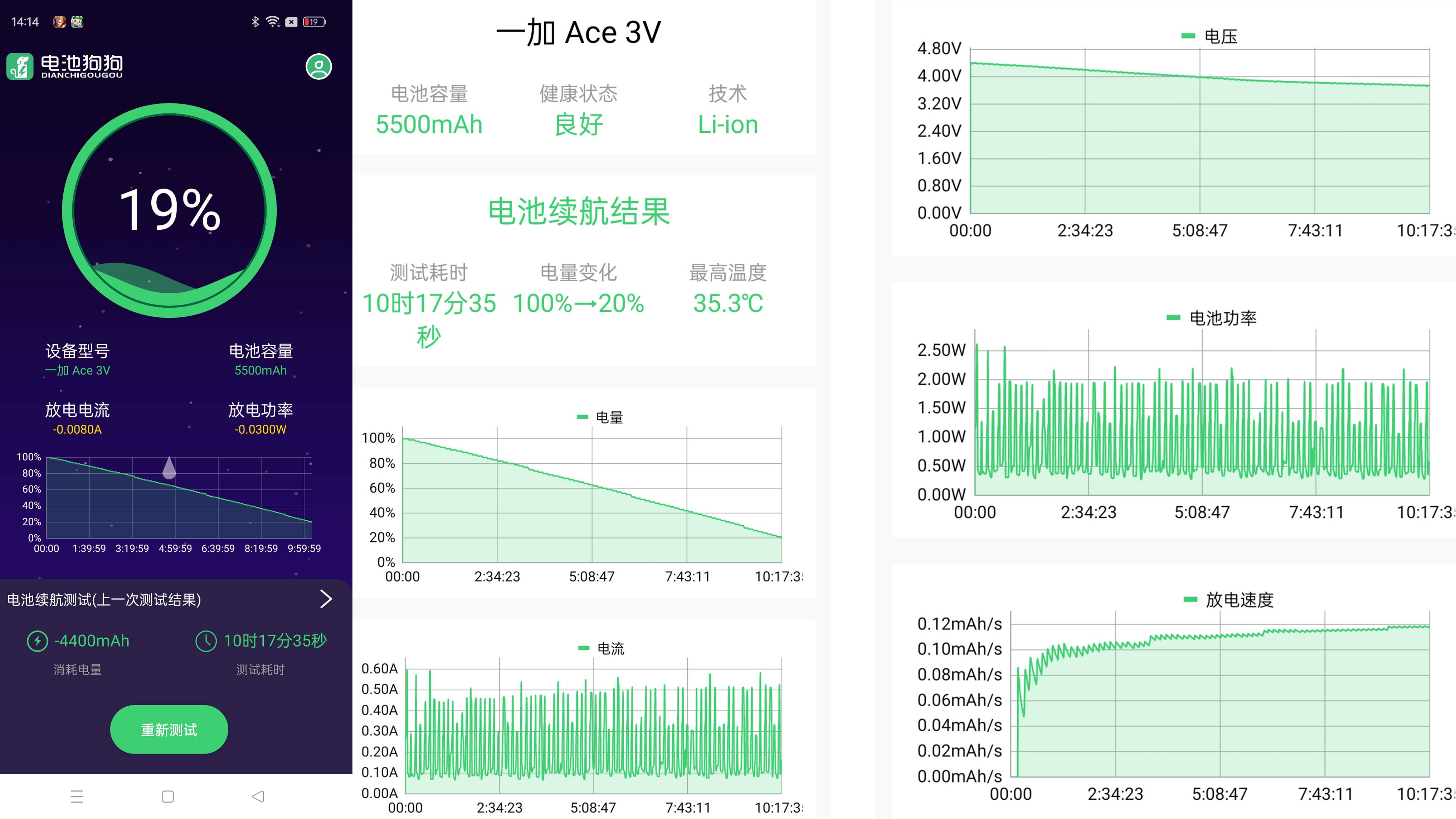 我这次也运用了两款软件,对设备的续航性能进行评估,覆盖了 GPU 高压测试、CPU 多线程运算、AI 识别功能、视频播放以及图片和网页浏览等多个维度。设备从满电状态(100%)下降至 20% 共需时长10小17分 53 秒。当电量降至 20% 时,该设备还能继续以待机模式运行达 3 小时25分钟,并能在屏幕常亮的状态下使用约 1 小时。基于日常使用场景,该设备的续航时间轻松超过十小时,显示出其卓越的续航能力。