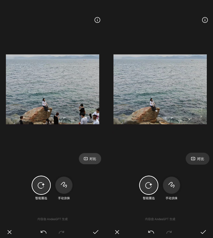 选择智能圈选,就会自动选中被消除的对象,然后进行消除了,可以多次反复消除,你看多个路人就被我消除掉了。而且涂抹痕迹很轻,感觉比电脑p还好,又快捷。
