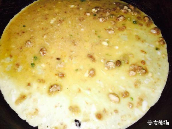7.饼铛放油烧热倒入一半打好的蛋液,晃动饼铛摊成蛋饼小火煎两分钟