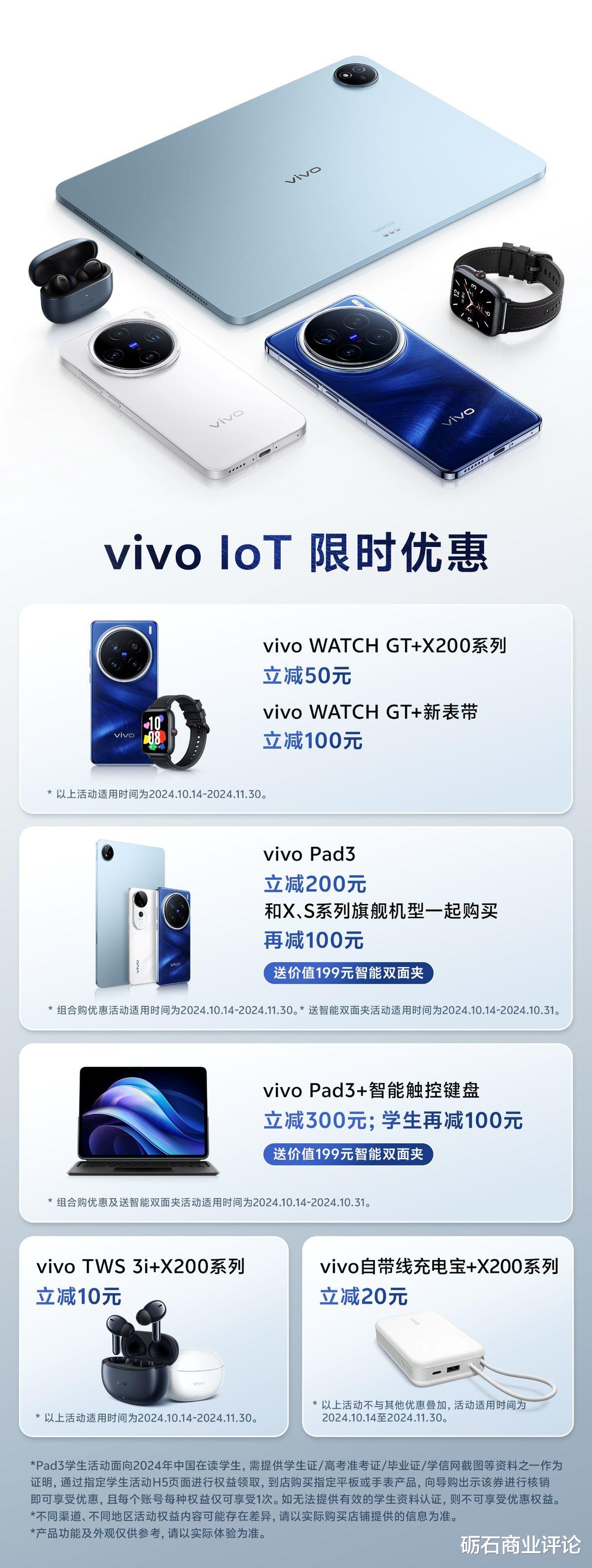 三款新品将于发布会结束后即刻开启预售,用户可享受最高24期免息分期、vivo care +买一年送一年或碎屏宝买一年送一年专项权益。vivo同时推出以旧换新活动,购买vivo X200系列新机,满300元补贴100元;vivo老用户换新力度升级,额外补贴200元,合计至高补贴1000元。vivo X200和vivo X200 Pro将于10月19日正式开售,vivo X200 Pro mini将于10月25日正式开售,用户可通过vivo官网、vivo京东自营官方旗舰店、京东vivo官方旗舰店、天猫vivo手机官方旗舰店、拼多多vivo官方旗舰店、vivo手机苏宁自营旗舰店、天猫苏宁易购官方旗舰店、招商银行掌上生活、分期乐、小红书、唯品会、中信银行动卡空间、平安银行口袋商城、vivo体验店专卖店、vivo终端各大门店等线上线下渠道预定或购买。首销前3天,购买vivo X200限量赠送vivo双肩包,购买vivo X200 Pro和vivo X200 Pro mini,限量赠送vivo TWS A3耳机,更可享价值超1200元的新机权益礼包。最终规则以店铺公示详细规则为准。
