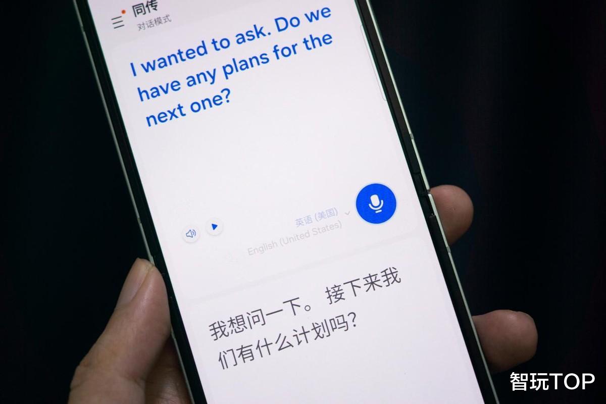 在出游或者工作中要跟外国人交流时,如果是电话,它支持通话实时翻译,甚至能AI屏蔽你原来的语言部分,让对方更好理解;如果是面对面,就可以开启同传,并通过其中的双屏对话模式,你通过内屏看对方说话后的翻译,对方也可以通过外屏了解你的意思,这样是不是让小折叠的形态优势发挥出了最大的效果?