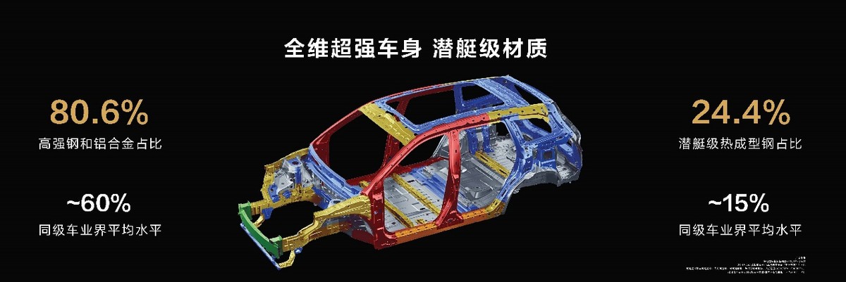 此外,问界新M7大五座在被动安全方面也独有建树。全车潜艇级热成型钢占比、高强钢占比全面优于现售BBA车型,车身潜水艇级热成型钢占比24.4%。每平方厘米可承受17吨重量,相当于一台重型卡车的重量。高强钢和铝合金占比超 80%,构建出铜墙铁壁,为乘客带来满满的安全感。