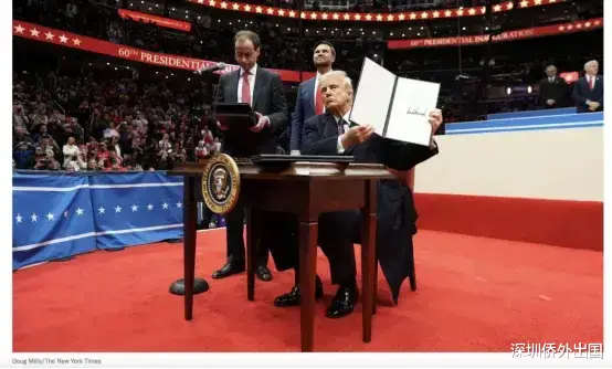 特朗普在舞台上的办公桌前签署了这些命令,场内人群欢呼不止。