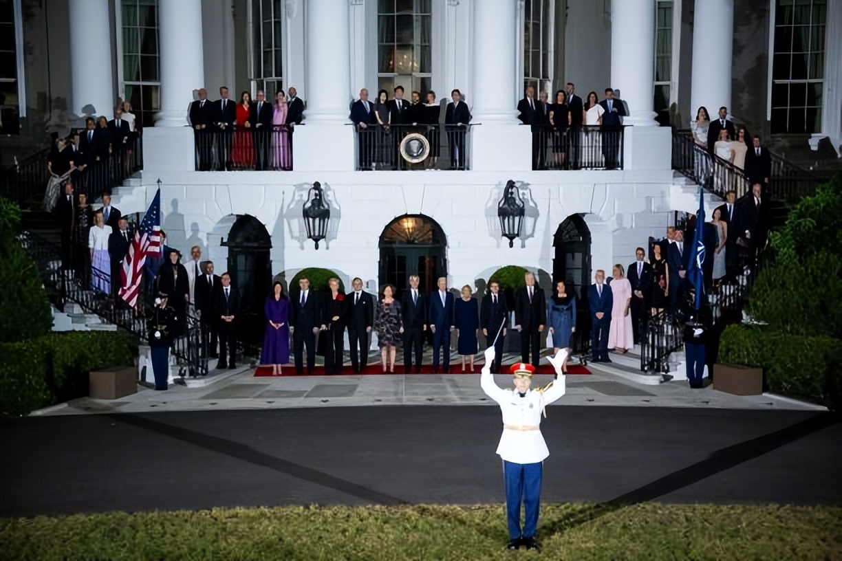 北约峰会大合影场面好大!白宫一楼二楼站满,太太团时尚比拼精彩