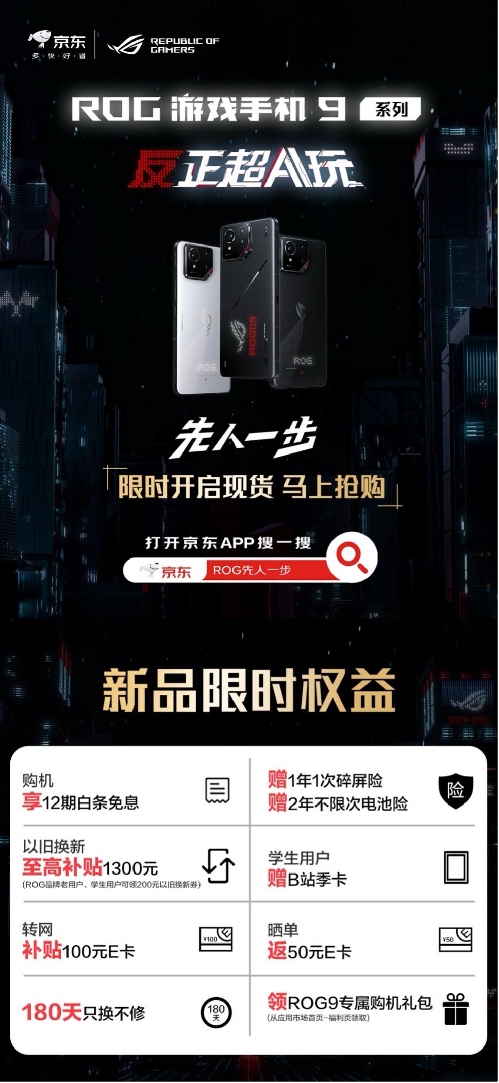 价格方面,ROG 9 12GB + 256GB 售价 4999 元、12GB + 512GB 售价 5499 元;ROG 9 Pro 16GB + 512GB 售价 6299 元、24GB + 1TB 售价 8499 元;酷冷风扇 X Pro 售价 599 元;ROG 冰川液冷壳售价 299 元。目前已开启预约购机,京东购机享 12 期白条免息,赠 1 年 1 次碎屏险、2 年不限次电池险,学生用户额外领 B 站季卡,现货开抢最快明天可到手新机。ROG 游戏手机 9 系列凭借全方位升级,将为玩家带来更极致体验。