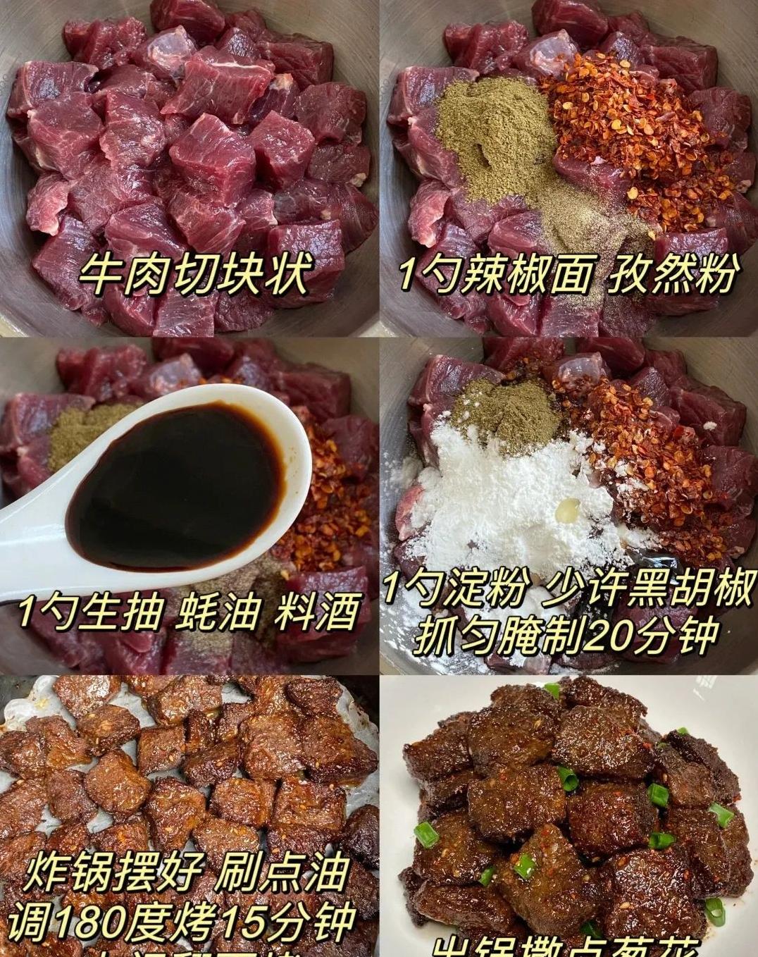 丢进空气炸锅后,只需耐心等待便能收获一盘香辣四溢的美味牛肉。