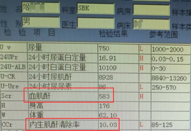 因为长期的蛋白流失引起了整体肾功能的下降,肾小球滤过率下降,导致毒素水平持续升高。最开始血肌酐高达583,内生肌酐清除率只有10.03。如果不及时控制清理毒素就可能要透析了。