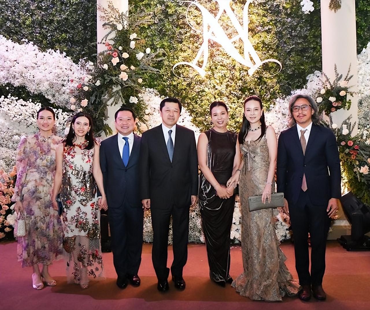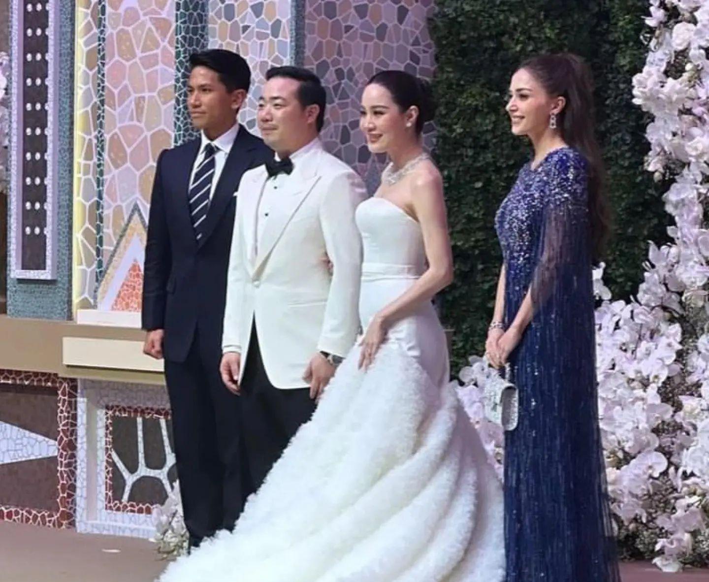 阿亚瓦特大婚不仅吸引了泰国贵族,还有来自文莱的马丁王子夫妇,与新娘新郎一同合影,成为婚礼上一道靓丽的风景。然而,文莱新王妃的惊艳亮相,尤其是那身蓝色钻石斗篷裙,差点抢了新娘的风头。