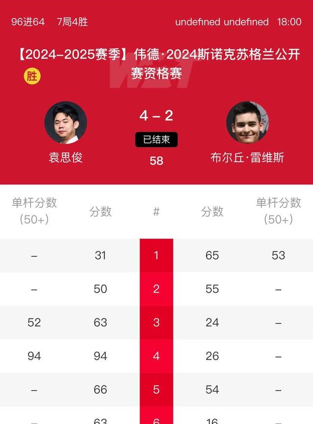 第一局雷维斯快速进入比赛状态单杆53分,以65-31拿到开门红,第二局两人打的琐碎胶着雷维斯以55-50赢得缠斗,第三局袁思俊几次上手单杆52分,以63-24赢得该局。第四局袁思俊延续上盘火热手感单杆94分再扳一局,大比分2-2。第五局两人打的琐碎胶着,缠斗许久袁思俊技高一筹最终以66-54赢下本局,大比分3-2反超拿到赛点。第六局袁思俊越战越勇以63-16赢得该局,在开局落后两局情况下袁思俊打出4连鞭的得分潮大比分4-2逆转击败雷维斯拿到正赛入场券。