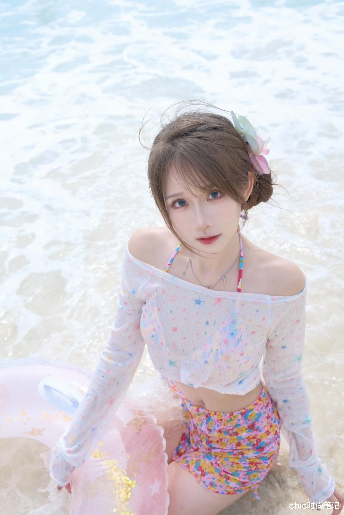 彩色碎花比基尼 + 白色碎花罩衫,清透又夏天,沙滩度假最佳拍档!