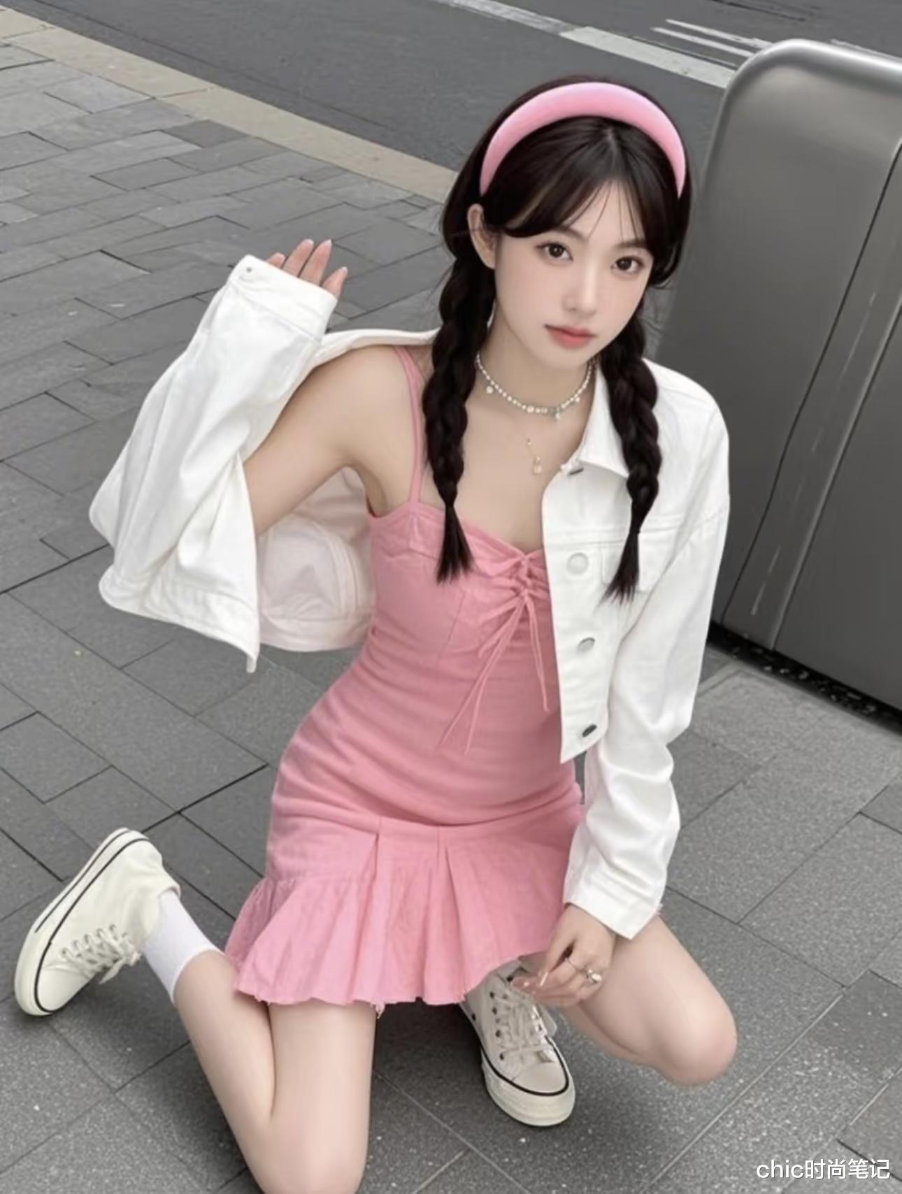 硬挺×柔软:白色工装外套 × 浅粉色雪纺吊带裙,温柔且少女感十足,是夏日水蜜桃feel~
