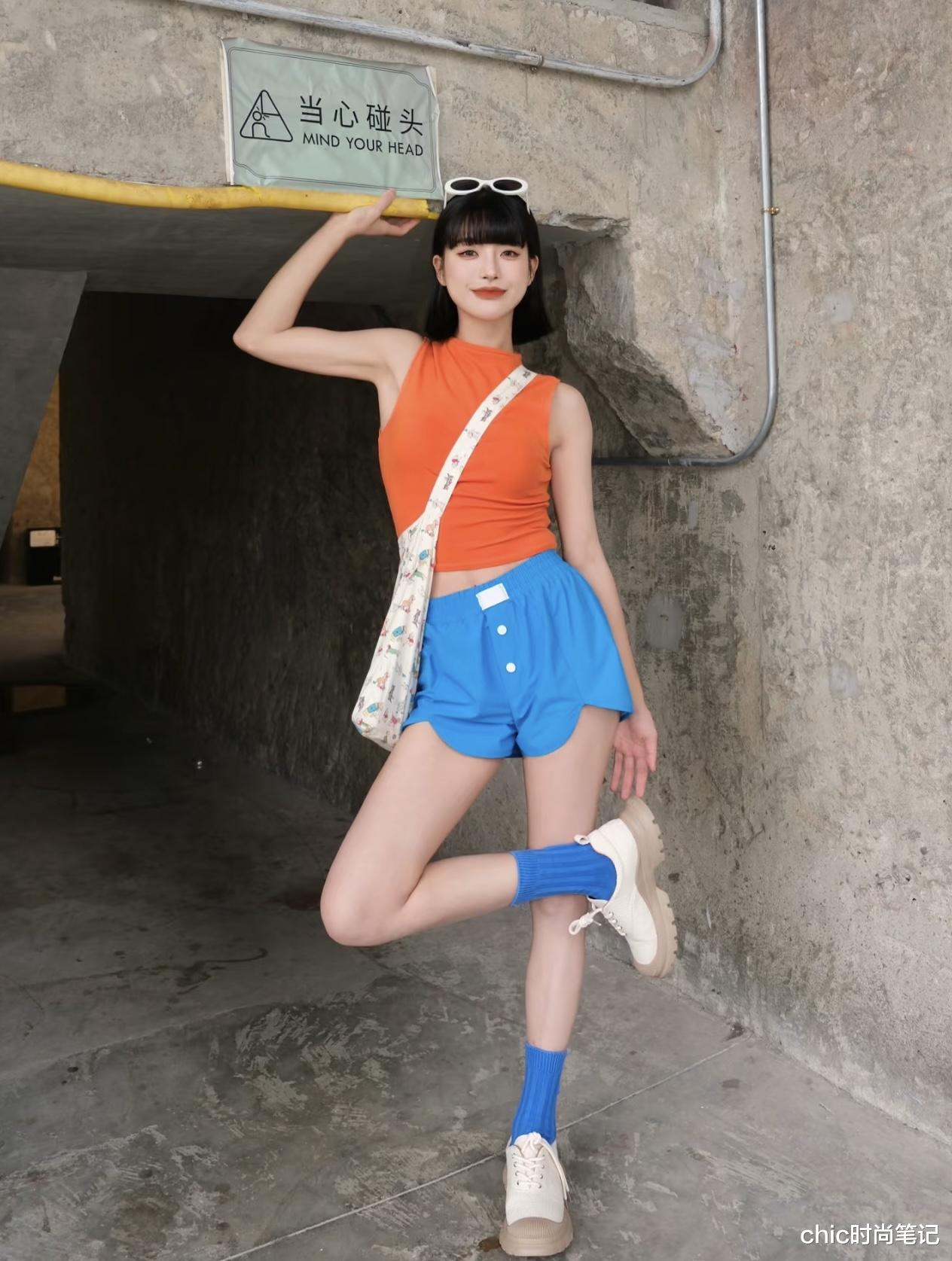 搭配公式:亮橙色针织短袖 +高腰克莱因蓝高腰短裤+小白鞋