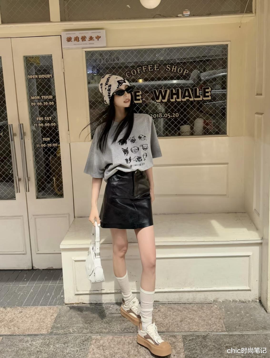 哑光×光泽:灰色色哑光T恤 × 黑色漆皮半裙,又酷又A的拽姐穿搭轻松get。