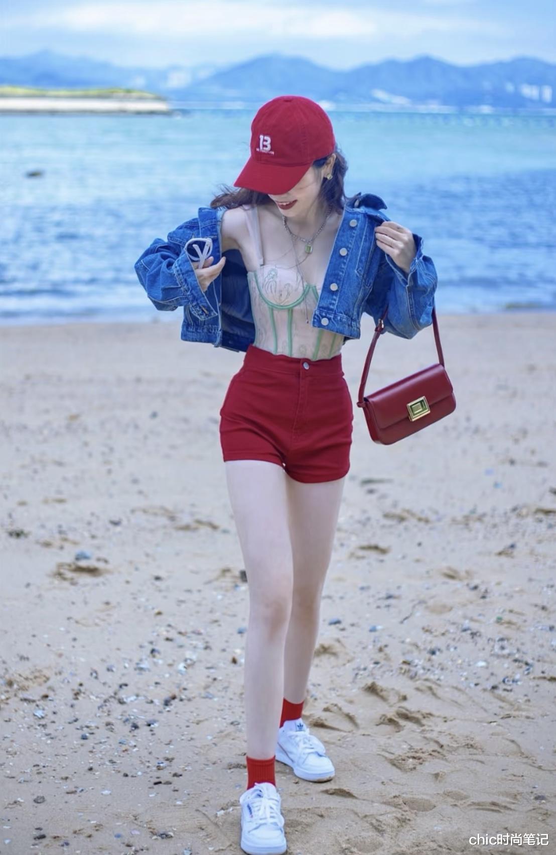 小麦色:适合热带风情配色(珊瑚红×孔雀蓝),蓝色短款牛仔上衣配红色高腰热辣短裤,显色又高级。