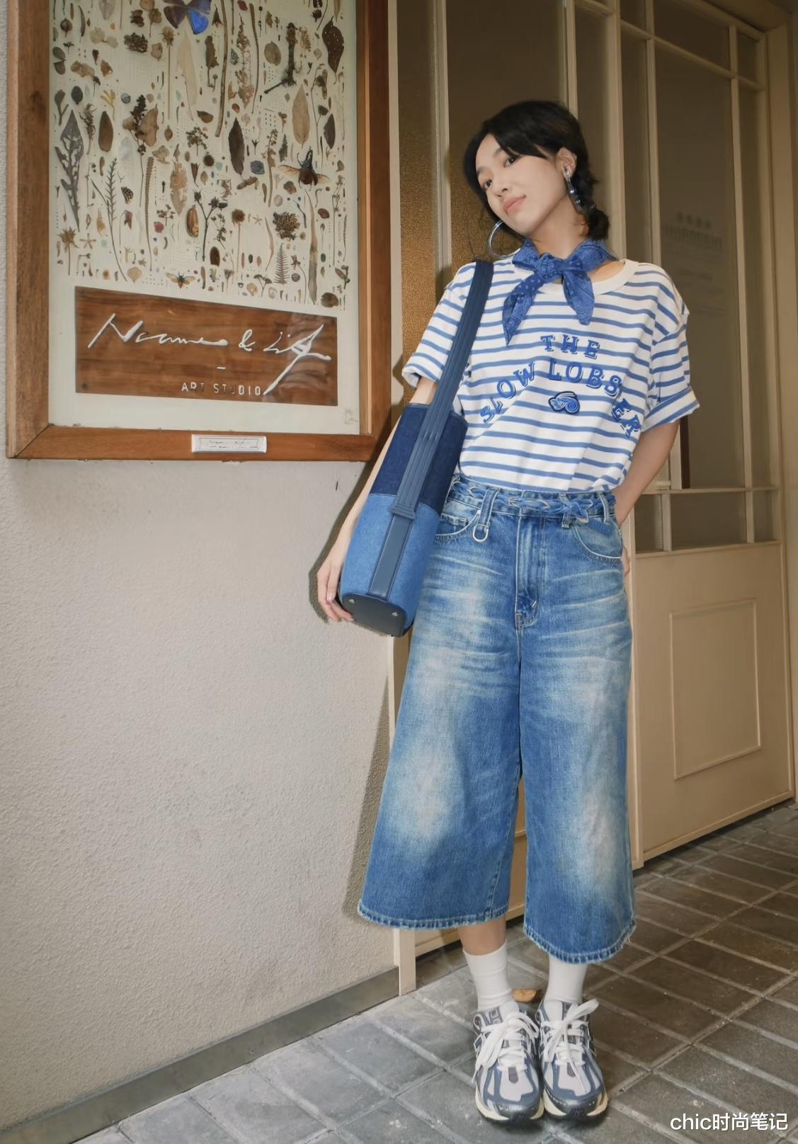 条纹/格纹单品自带色彩过渡,如蓝白条纹衫搭配蓝色七分牛仔裤加银白色运动鞋,活力且夏天。