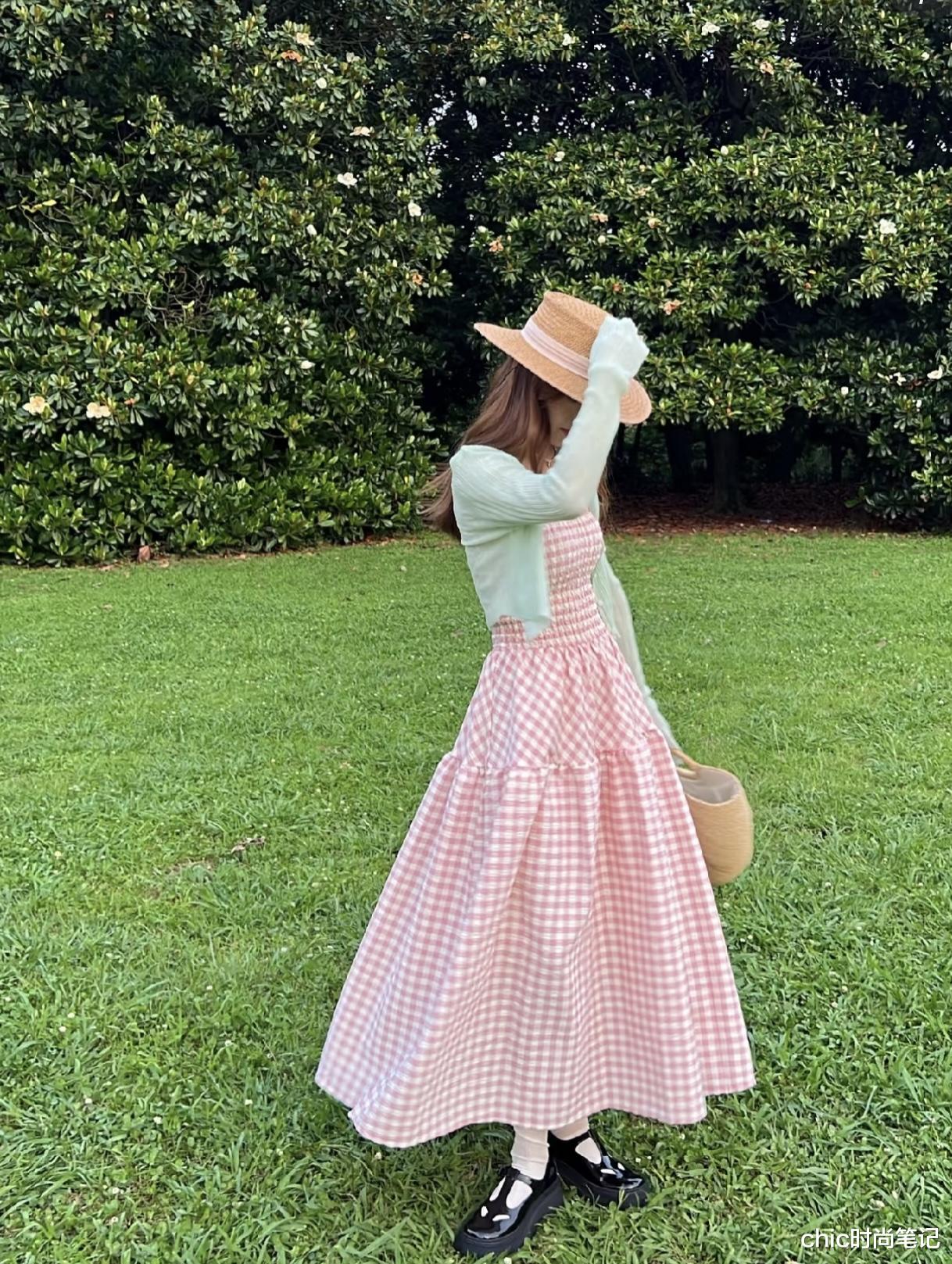 搭配公式:薄荷绿针织薄款外套 +粉白格子纯棉连衣长裙 +黑色玛丽珍单鞋