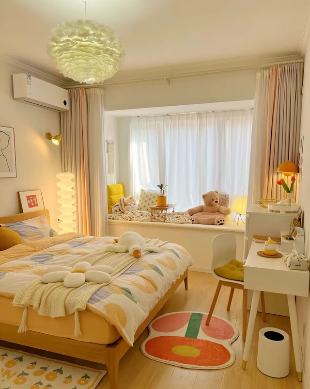 卧室延续了整个家的风格,以温暖色调为主。她说自己特别注重睡眠环境,所以床品全部是亲肤的纯棉材质,连枕头也分软硬两种替换。床头柜上放了一盏小台灯和几本正在读的书,窗边是一把旧木椅,上面铺着绵软的羊毛毯,晚上一杯热牛奶,一本旧小说,就能让她慢慢放松下来。